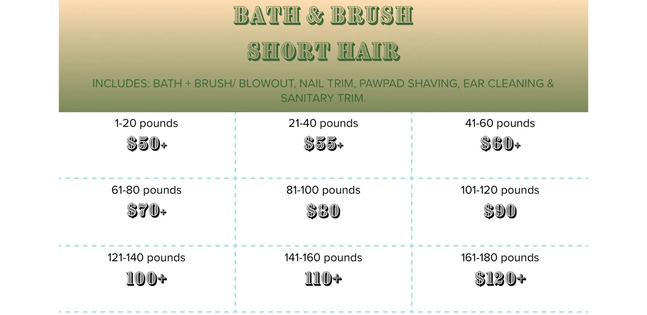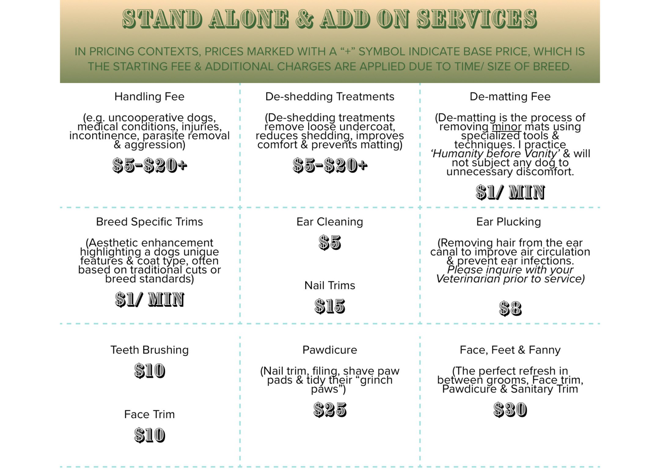 If you have any questions about the pricing structure, you’re always welcome to reach out before your dog’s appointment. I’m happy to explain how pricing is determined and ensure full transparency. As a one-on-one groomer, my pricing reflects the individual time, care, and calm environment your dog receives — a very different experience from high-volume commercial salons that groom multiple dogs simultaneously.