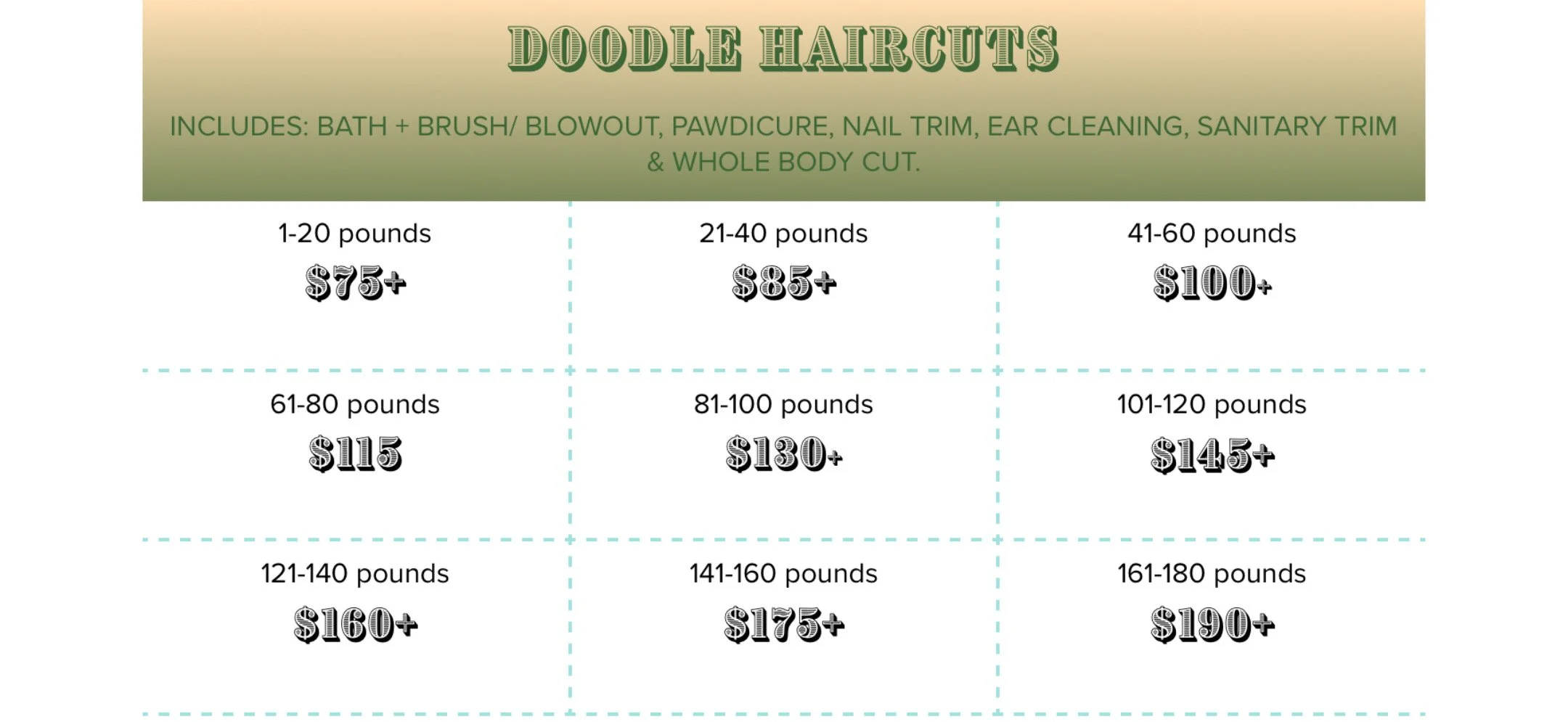 Doodles (poodle mixes) have a unique combination coat that requires increased maintenance, additional time, and accelerated wear on grooming tools, which is why they are placed in their own pricing categories.