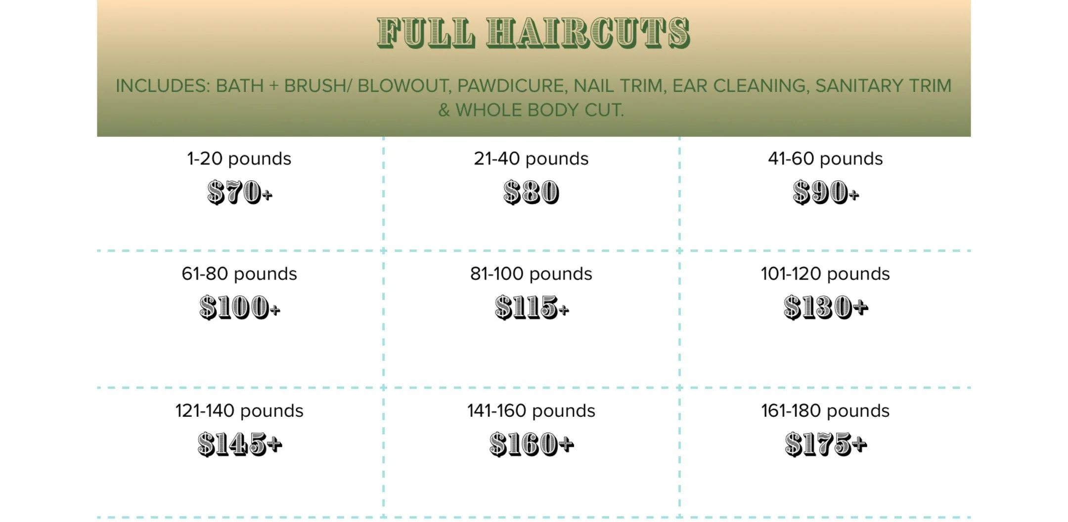 Bonafide Dog Cuts grooming services are thoughtfully structured based on coat type and coat length, followed by full haircuts for breeds that require them. Base pricing for each service is determined by your dog’s weight, which helps keep pricing fair and consistent — larger dogs naturally require more time, handling, and physical work to complete their groom safely and thoroughly. A veterinarian-grade scale is available in the salon if you’re unsure of your dog’s weight or have a growing puppy, and every dog is weighed prior to each appointment.